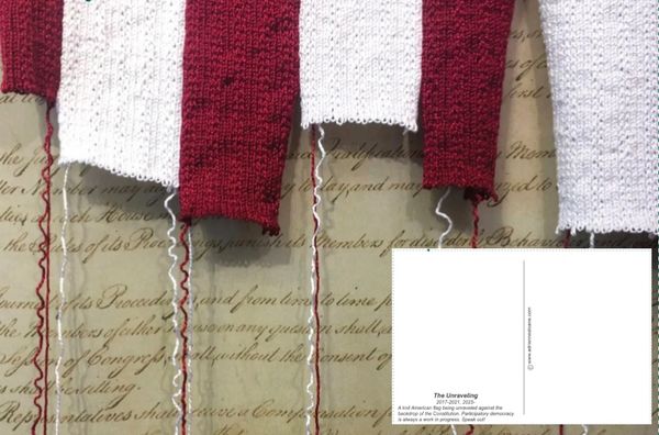 After a final showing at the Massachusetts State House followed by a year of quarantine there, The Unraveling came home in April, 2021. Remaining as it was then, it was shown again this summer 2024 at LexArt in the exhibit Free Speech: Art & Activism where it was awarded Best of Show.